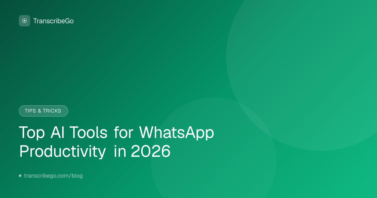 | Transcribe voice notes + reminders | TranscribeGo | Automatic, 90+ languages, AI reminders, works on WhatsApp + Telegram + web |