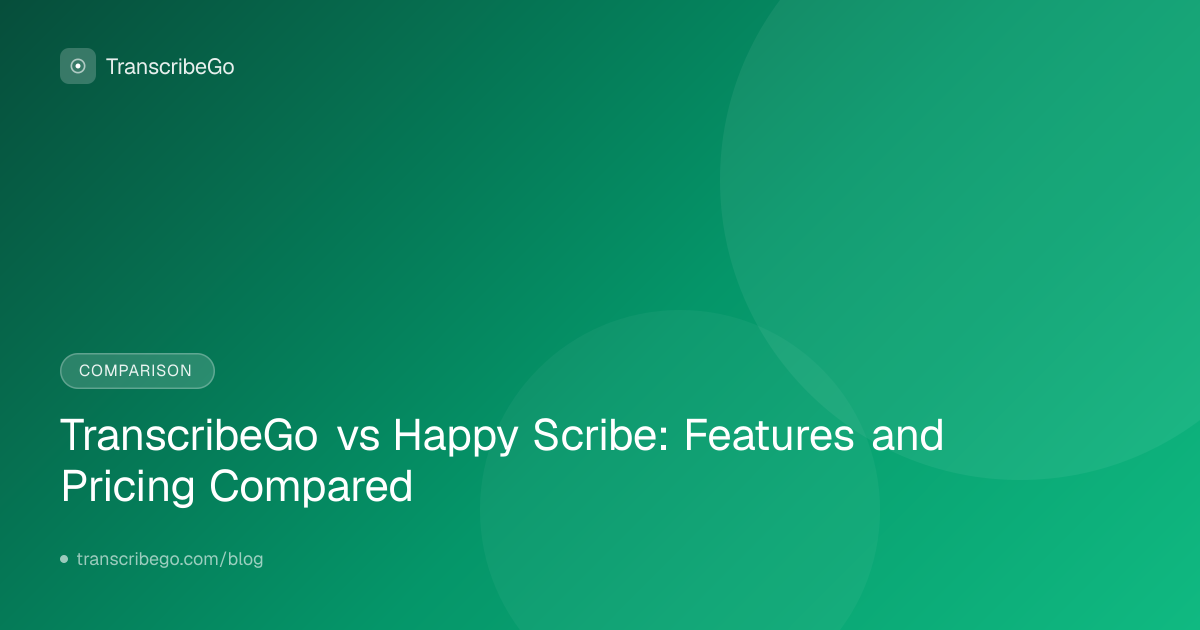 Transkripsi AI Happy Scribe memberikan akurasi hingga 85%, sementara AI dual-engine TranscribeGo secara konsisten mencapai akurasi 95β98%. Happy Scribe menawarkan transkripsi manusia seharga $2.00/menit untuk akurasi 99%, tetapi itu secara signifikan meningkatkan biaya dan waktu penyelesaian. Bagi sebagian besar pengguna, akurasi AI TranscribeGo menghilangkan kebutuhan untuk tinjauan manusia.